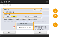 기기의 날짜/시간을 조정합니다. 지정된 시간에 자동으로 이메일을 전송하는 경우 날짜/시간이 사용되기 때문에 이러한 설정은 정확하게 해야 합니다.
