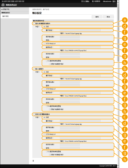 設定視覺訊息功能時,無論時間如何,都可以從首頁上的 <視覺訊息> 檢查內容。會顯示最後顯示的內容。 將位於相同網路的檔案伺服器或 進階郵件信箱 中儲存的檔案設為要顯示的內容。當作簡單的檔案伺服器使用 您也可以透過 Proxy 伺服器將網際網路上的網站設定為內容。此功能所用的 Proxy 設定與 <代理伺服器設定> 中的設定相同。 如果有啟用強制保留列印功能並勾選 [列印工作開始時顯示] 核取方塊,內容會在列印開始時顯示。 |
