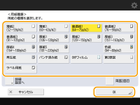 2 | 用紙サイズを選び、<OK>を押す ![]() ![]() インチサイズを選択する場合は、<インチサイズへ>を押します。 |