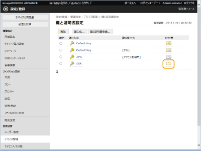 CSRを生成した鍵は、鍵と証明書の一覧画面に表示されますが、このままでは使用することができません。この鍵を使用するには、CSRを基に発行された証明書を登録する必要があります。 鍵に証明書を登録する |