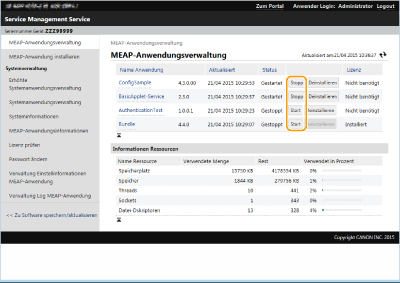 Wenn Sie auf die Schaltfläche [Start] / [Stopp] klicken, die sich rechts neben dem Betriebsstatus befindet, können Sie die MEAP-Anwendung starten oder stoppen.