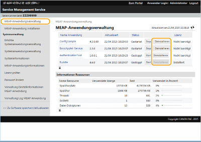 Zusätzlich zum Überprüfen von Details und dem Ändern von Einstellungen, können Sie die MEAP-Anwendungen aktualisieren oder Anwendungen mithilfe der Funktion SMS über die Remote UI deinstallieren.