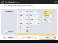 1 | Drücken Sie <Anwenderdef.Format>. ![]() Sie können das Papierformat als <Sonderformat> angeben, sodass Sie die Einstellung für das Papierformat nicht eingeben müssen. Legen Sie <Sonderformat> fest, wenn Sie Papier eines unbekannten Formats zum Kopieren einlegen oder wenn das Papierformat bereits im Druckertreiber gespeichert ist. |