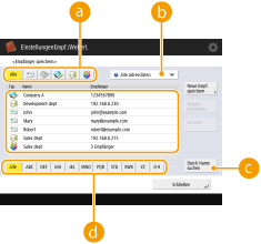 Wählen Sie die jeweilige Schaltfläche, um Ziele nach Funktion, wie Fax oder E-Mail, zu filtern.