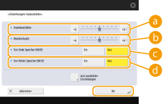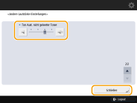 <Alarmlautstärke>Passen Sie die Lautstärke des Tons an, der ausgegeben wird, wenn eine Faxübertragung abgebrochen wird oder wenn der Druck einer empfangenen Faxnachricht abgeschlossen ist. Wenn kein Ton ausgegeben werden soll, drücken Sie ganz links auf