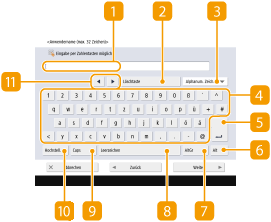 Auf Bildschirmen, die alphanumerische Eingaben erfordern, geben Sie die Zeichen über die Tasten im Sensordisplay ein. Um Zahlen einzugeben, können Sie auch die Zahlentasten auf dem Bedienfeld verwenden (Bedienfeld).