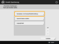 Wenn das Gerät so konfiguriert ist, dass Anwender sich beim Start anmelden müssen (Festlegen, wann das Anmeldefenster angezeigt werden soll), wird <Standardanz. bei Startup/Wiederherstellung> als Element in <Persönliche Einstellungen> angezeigt. Der nach dem Gerätestart angezeigte Bildschirm kann für jeden Anwender festgelegt werden.