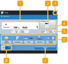 Zeigt den Einstellungsstatus, wie zum Beispiel Kopierfaktor, Papierformat und Anzahl der Kopien, an. Achten Sie darauf, die Einstellungen zu prüfen, um ordnungsgemäß kopieren zu können. Drücken Sie zur Änderung der Einstellung die Schaltfläche unterhalb des Anzeigebereichs. Grundlegende Kopierfunktionen