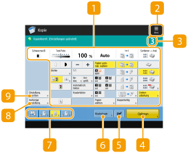 Zeigt den Einstellungsstatus, wie zum Beispiel Kopierfaktor, Papierformat, Anzahl der Kopien usw. an. Achten Sie darauf, die Einstellungen hier zu prüfen, um ordnungsgemäß kopieren zu können. Drücken Sie zur Änderung der Einstellung die Schaltfläche unterhalb des Anzeigebereichs. Grundlegende Kopierfunktionen