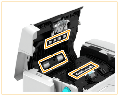 ![]() | Wischen Sie die Rollen (insgesamt drei Stellen) an der Innenseite der inneren Abdeckung ab. Befeuchten Sie ein weiches Tuch mit Wasser, und wringen Sie es gut aus, wischen Sie dann die Walzen damit ab. Wischen Sie anschließend die Walzen mit einem weichen und trockenen Tuch ab. Warten Sie, bis das Gerät vollständig trocken ist, bevor Sie mit dem nächsten Schritt fortfahren. |