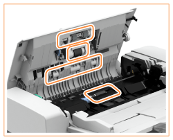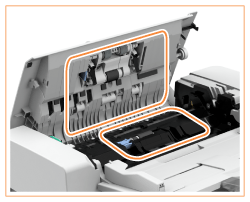 Wenn eines der folgenden Probleme beim Scannen des Dokuments über die Zufuhr auftritt, führen Sie die Reinigung der Zufuhr durch. Das Dokument kann nicht einwandfrei gescannt werden Das Format des Dokuments kann nicht korrekt erkannt werden Das Dokument wird beim Scannen verschmutzt Papierstau tritt häufig auf |