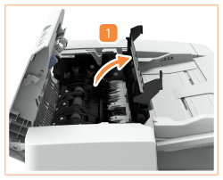 ![]() | Ziehen Sie den oberen Hebel, um die Abdeckung des Scanbereichs des Dokumenteneinzugs zu öffnen. Öffnen Sie die Abdeckung vorsichtig, um das Vorlagenglas nicht zu beschädigen. ![]() |