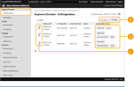 Sie können Remote UI zum Überprüfen des Status der Dokumente, die auf ihre Verarbeitung warten, sowie der Protokolle der Dokumente, die verarbeitet wurden, verwenden. Sie können auch den Status des Geräts wie beispielsweise Fehlerinformationen und verbleibende Menge der Verbrauchsmaterialien überprüfen.