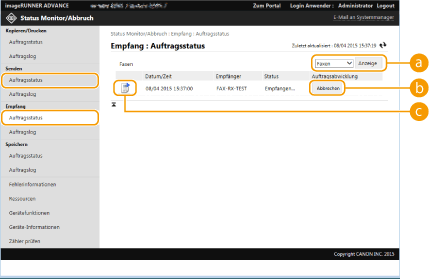 [Auftragsstatus] unter [Senden] oder [Empfangen]