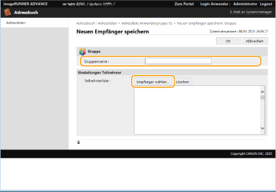 Sie können die Adresslisten der Benutzergruppe auch verwalten, indem Sie nur Benutzern mit Administratorrechten das Registrieren/Bearbeiten von Zielen über die Remote UI ermöglichen. (<Empfänger einstellen>  <Adressliste Anwendergruppe verwenden>)