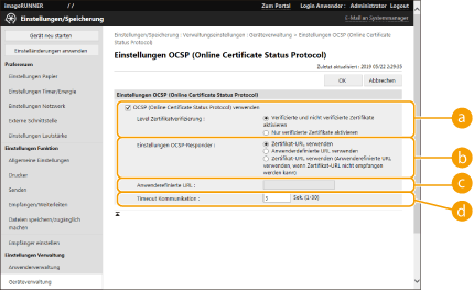 Es gibt zwei Methoden, um zu überprüfen, ob die von der anderen Partei in der Kommunikation erhaltenen Zertifikate gültig sind: Vergleich mit der im Gerät registrierten Zertifikatsperrliste (CRL) und Abfrage eines OCSP-Responder (Online Certificate Status Protocol) (ein Server, der OCSP unterstützt). Legen Sie die Methode zur Überprüfung des Ablaufs von Zertifikaten entsprechend Ihrer Umgebung fest. Diese Registrierung kann nur vom Administrator vorgenommen werden.