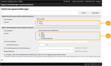 Um das Gerät als Server-/Clientgerät zu verwenden, wählen Sie [Start] für [Service] sowohl unter [Eigene Einstellungen synchronisieren (Server)] als auch unter [Eigene Einstellungen synchronisieren (Client)] aus.