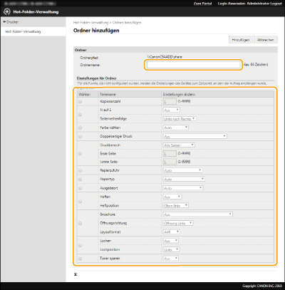 Geben Sie den Ordnernamen des Hot Folder ein, und legen Sie die erforderlichen Einstellungen fest.