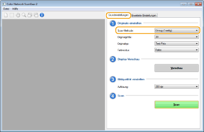 Wählen Sie unter [Scan-Methode] der Registerkarte [Grundeinstellungen] die Position aus, an der das Original platziert wurde.
