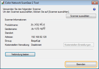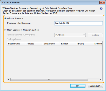 [Color Network ScanGear 2 Tool].1 | Klicken Sie auf [Adresse festlegen], und geben Sie die IP-Adresse oder den Hostnamen des Geräts in das Textfeld [IP-Adresse oder Hostname] ein. |