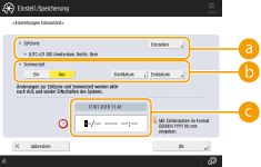 Wenn Sie die Einstellung von <Zeitzone> oder <Sommerzeit> geändert haben, müssen Sie das Gerät durch Ausschalten der Stromversorgung neu starten. Drücken Sie zum Ausschalten den Netzschalter (Ausschalten des Geräts), warten Sie mindestens 10 Sekunden, nachdem die Bereitschaftsanzeige erloschen ist, und schalten Sie dann das Gerät wieder ein (Einschalten des Geräts).