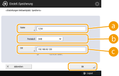 <Ort> wird angezeigt, wenn Sie <SMB> auswählen, und <Hostname> wird angezeigt, wenn Sie <WebDAV> in der Protokolleinstellung auswählen.