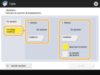 Si desea mover la imagen en el reverso al copiar ambas caras, <Reverso> es necesario configurarlo. Para mover a la misma posición que en el anverso, pulse <Igual que en anverso>. Para mover simétricamente, pulse <Al contrario del anverso>. Para mover a una posición distinta de la del anverso, pulse <Establecer> e introduzca la distancia de movimiento.