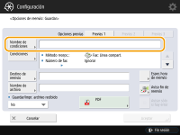 Si selecciona <Reenviar sin condiciones>, puede reenviar todos los documentos recibidos que no cumplan las condiciones especificadas al destino deseado. Puede reenviar a múltiples destinos especificando un destino de grupo en <Destino de reenvío>. Sin embargo, si el destino especificado es un destino de grupo que contiene un Buzón de correo, el documento no se reenviará a ese Buzón de correo. <Espec.hora de reenvío> le permite especificar la hora y el día para realizar el reenvío. Si configura <Aviso fin de reenvío>, podrá enviar una notificación que indique que se realizó el reenvío. Puede seleccionar <Avisar sólo si hay error>, de manera que no se le notifique de un reenvío correcto. Si establece <Guardar/Impr. archivo recibido> en <Sí>, podrá almacenar o imprimir el archivo recibido por la siguiente configuración de Bloqueo de memoria. El archivo recibido se almacena si el Bloqueo de memoria es <Sí> y se imprime si el Bloqueo de memoria es <No>. |