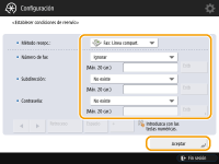 Si ha añadido líneas, también puede especificar una línea determinada. En este caso, seleccione <Fax: Línea 1>, etc. para <Método de recepción>. No puede cambiar el <Método de recepción> después de registrar las <Opciones de reenvío>. Para utilizar opciones de reenvío tras cambiar el <Método de recepción>, tiene que volver a registrar las opciones de reenvío. |