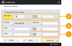 ![]() | El equipo puede generar la clave y el certificado (certificado de servidor) empleados para la comunicación cifrada TLS. Si desea empezar a utilizar la comunicación cifrada TLS de inmediato, resulta práctico utilizar la clave y el certificado preinstalados en el equipo. Si es preciso, pida a un administrador que genere una clave y un certificado. Tenga en cuenta, no obstante, que la comunicación cifrada TLS no se habilita simplemente generando una clave y un certificado. Configurar la clave y el certificado para TLS |