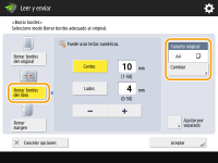 <Borrar bordes>.1 | Pulse <Borrar bordes del original> y consulte <Tamaño original>. ![]() Si el tamaño que aparece en <Tamaño original> es distinto al tamaño del original, pulse <Cambiar> para seleccionar el tamaño. Solo se podrán escanear los tamaños originales mostrados en la pantalla del panel táctil. |