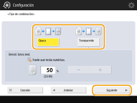 Para superponer la imagen de formulario sin ajustar la densidad, pulse <Opaca>. Para superponer la imagen de formulario con la densidad reducida, pulse <Transparente> y ajuste la densidad.