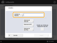 2 | Configure las opciones necesarias. ![]() <Validez>Configure el periodo de caducidad para la SA de IPSec generada. Recuerde configurar <Hora> o <Tamaño>. Si configura ambas opciones, se aplicará la opción cuyo valor se alcance primero. <PFS>Si activa la función de Confidencialidad directa total (PFS) (<Sí>), aumenta la confidencialidad de la clave de cifrado, pero la velocidad de la comunicación es menor. Por otra parte, hay que habilitar la función PFS en el dispositivo del interlocutor de la comunicación. <Algoritmo autenticación/cifrado>Seleccione <Auto> o <Configuración manual> para configurar cómo especificar el algoritmo de autenticación y cifrado para IKE fase 2. Si selecciona <Auto>, se configura automáticamente el algoritmo de autenticación y cifrado ESP. Si desea especificar un método de autenticación concreto, pulse <Configuración manual> y seleccione uno de los métodos de comunicación a continuación.