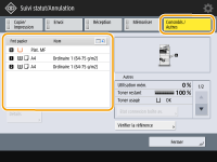 Il se peut qu'il n'y ait pas de bourrage papier à l'endroit indiqué, même dans ce cas, vérifiez tous les autres emplacements indiqués dans les instructions affichées à l'écran. L'écran indiquant qu'il y a un bourrage papier s'affiche de manière répétée jusqu'à ce que vous ayez éliminé le bourrage papier. Si vous appuyez sur <Fermer> sur l'écran indiquant un bourrage papier, l'opération peut continuer avec les réglages sélectionnés sans correction immédiate du bourrage papier. Ne retirez pas le papier d'un emplacement autre que celui qui est affiché comme emplacement de bourrage papier à l'écran. Cela peut causer des bourrages papier dans d'autres emplacement ou des pages manquantes dans les documents imprimés. |