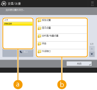 (设置/注册)会显示<设置/注册>屏幕。先按此键对每项设置进行更改,例如纸张设置、显示设置和网络设置。在此屏幕上,还可以注册接收方,例如电子邮件地址和传真号码。