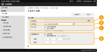 导入从具有高级存储箱用户访问控制的佳能机器导出的用户信息。文件扩展名为"csv"。