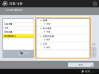 如果要为PDF文件格式选择压缩或轮廓与平滑,或为XPS文件格式选择压缩,则建议将<数据压缩比>设置为<普通>或<低压缩比>。如果设置为<高压缩比>,则即使在<生成文件> <压缩的图像质量优先级>中选择<图像质量优先>,输出的图像质量也可能较低。发送传真时会禁用此设置。 |