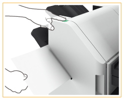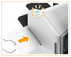 1 | 스테이플 피니셔 또는 소책자 피니셔의 슬릿으로 원하는 용지 묶음을 넣습니다. 용지 앞면을 아래로 향하게 하여 스테이플링하려는 용지 묶음 가장자리를 슬릿 쪽으로 넣습니다. 용지 묶음이 감지되면 스테이플 버튼이 깜박이기 시작하고 자동 스테이플링이 이뤄집니다. 지정된 예정 스테이플링 시작 시간을 기다리지 않고 스테이플링을 수행할 수 있습니다. 한 손으로 종이 묶음을 들고 다른 손으로 스테이플 버튼을 누릅니다. |