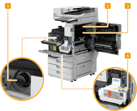 기기 내 걸린 용지를 제거할 때 이 커버를 엽니다.