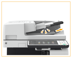 크기가 큰 원고를 넣을 때는 원고가 피더 밖으로 떨어지지 않도록 원고 공급 트레이 확장 및 원고 배지 트레이 확장을 꺼냅니다(트레이 확장은 Single Pass DADF-A에만 사용할 수 있음).