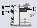 Staple Finisher-Y 또는 Booklet Finisher-Y | <트레이 A> 2 복사, 2 저장파일 이용, 2 프린터, 1 수신, 기타, 1 IP 팩스, 1 팩스 <트레이 B> 1 복사, 1 저장파일 이용, 1 프린터, 수신, 기타, IP 팩스, 팩스 <트레이 C> 복사, 저장파일 이용, 프린터, 수신, 1 기타, IP 팩스, 팩스 | ![]() |