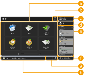 이러한 버튼을 사용하여 "복사" 및 "스캔하고 송신"과 같은 기본 기능 화면을 열 수 있습니다.