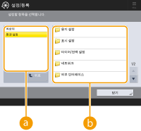(설정/등록)을 누릅니다. 용지 설정, 디스플레이 설정 및 네트워크 설정과 같은 각 설정을 변경하려면 먼저 이 키를 누릅니다. 이 화면에서 이메일 주소 및 팩스 번호와 같은 수신인도 등록할 수 있습니다.
