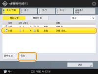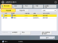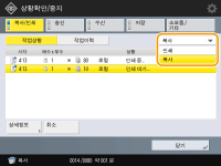 복사 작업이 대기 중일 때 제어판에서 (중지)을 누르면 모든 복사 작업이 일시 중지되고 <<중지>취소할 복사작업을 선택해 주십시오.> 메시지와 복사 작업 목록이 표시됩니다. 목록에서 복사 작업을 선택하고 <취소>를 눌러 작업을 취소할 수 있습니다. 복사를 재개하려면 <복사재개>를 누릅니다. |