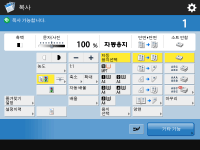 복사 배율, 용지 크기, 복사 부수 등 설정 상태를 표시합니다. 제대로 복사하려면 여기에서 설정을 꼭 확인해야 합니다. 설정을 변경하려면 표시 영역 아래에 있는 버튼을 누르십시오.