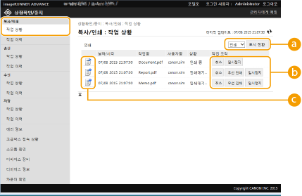 복사 또는 인쇄 대기중인 문서의 상태를 확인할 수 있습니다. 특정 문서를 먼저 출력하거나 문서를 취소할 수 있습니다.