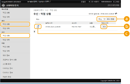 전송 대기중인 팩스 및 이메일, 수신된 팩스, 전송 대기중인 팩스의 상태를 확인할 수 있습니다. 문서 전송 및 수신 작업의 취소도 가능합니다.