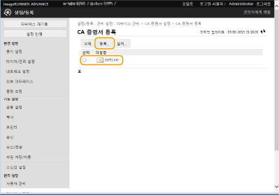 리모트 UI를 사용하여 키/인증서, CA 인증서 및 S/MIME 인증서를 컴퓨터에서 기기에 등록할 수 있습니다. 관리자를 지정하여 이 항목들을 등록합니다.