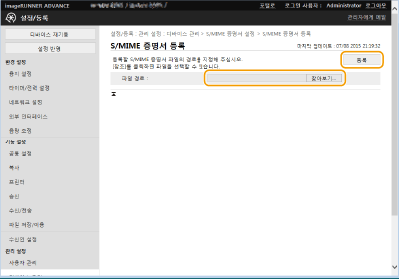 S/MIME를 사용한 이메일/I-팩스 암호화에 사용할 공개 키 인증서(S/MIME 인증서)를 등록할 수 있습니다. 기기에 등록 가능한 S/MIME 인증서 정보는
