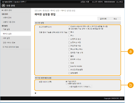 "기기 시작 시" 또는 "기능 버튼을 누른 후" 중 하나를 선택하여 로그인 화면 표시 시점을 지정할 수 있습니다. "기능 버튼을 누른 후"를 선택하면, 사용자 로그인을 요하는 기능을 지정할 수 있습니다. 지정되어 있지 않은 기능은 미등록 사용자도 이용할 수 있습니다.